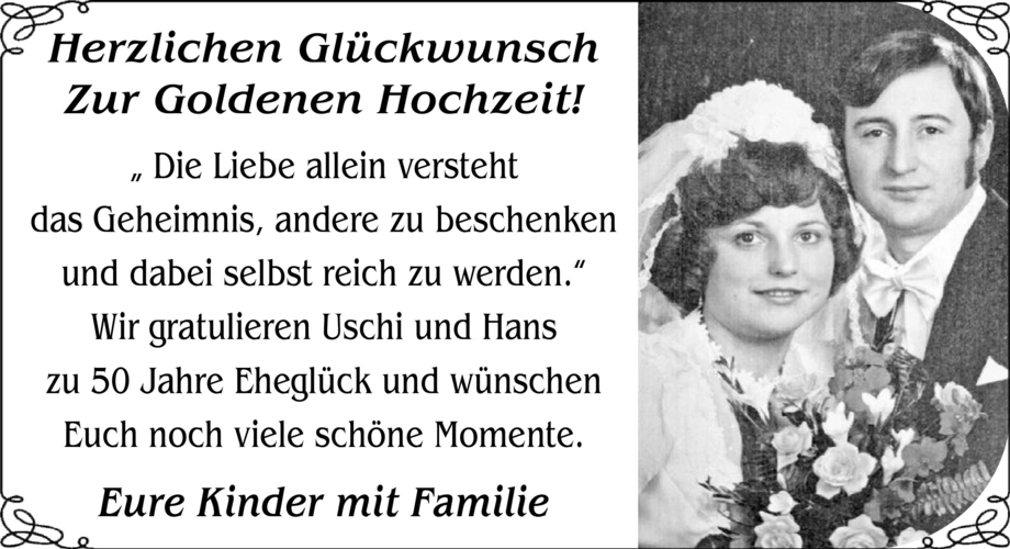 Die Liebe allein versteht das Geheimnis, andere zu beschenken und dabei selbst reich zu werden. Wir gratulieren Uschi und Hans zu 50 Jahre Eheglück und wünschen Euch noch viele schöne Momente.