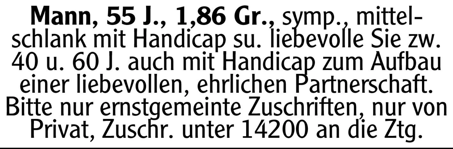 Mann, 55 J., 1,86 Gr., symp., mittelschlank mit Handicap su. liebevolle Sie zw. 40 u. 60 J. auch mit Handicap zum Aufbau einer liebevollen, ehrlichen Partnerschaft. Bitte nur ernstgemeinte Zuschriften, nur von Privat, Chiffre-Nr.: 14200