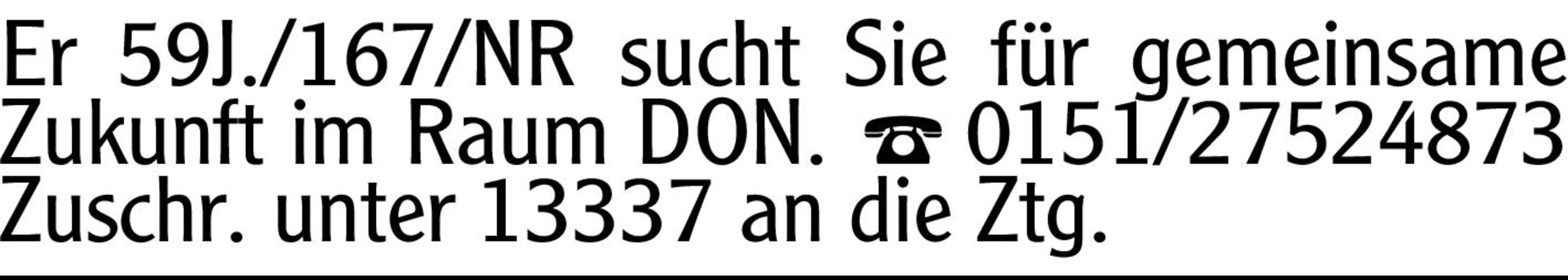 Er 59J./167/NR sucht Sie für gemeinsame Zukunft im Raum DON. Tel. 0151/27524873 Chiffre-Nr.: 13337