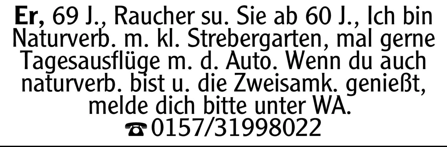 Er, 69 Jahre alt, Raucher, suche Sie ab 60 Jahren.