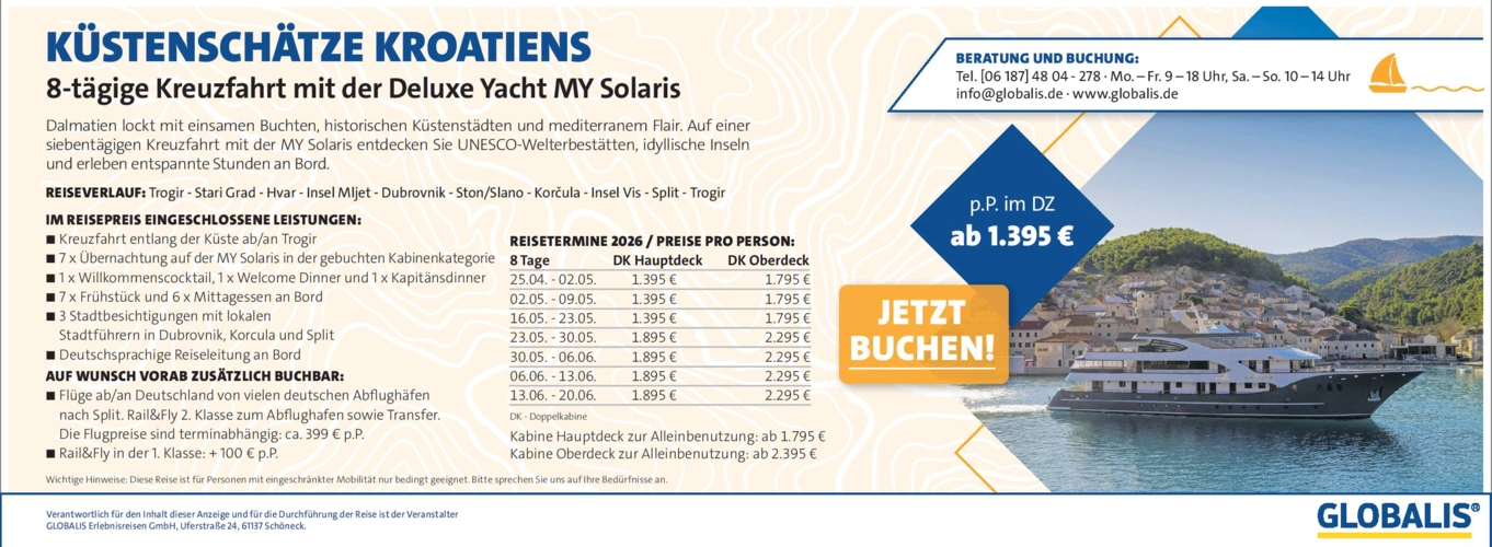 KÜSTENSCHÄTZE KROATIENS 8-tägige Kreuzfahrt mit der Deluxe Yacht MY Solaris BERATUNG UND BUCHUNG: Tel. [06 187] 48 04 - 278 · Mo. Fr. 9 18 Uhr, Sa. So. 10 14 Uhr info@globalis.de · www.globalis.de Dalmatien lockt mit einsamen Buchten, historischen Küstenstädten und mediterranem Flair. Auf einer siebentägigen Kreuzfahrt mit der MY Solaris entdecken Sie UNESCO-Welterbestätten, idyllische Inseln und erleben entspannte Stunden an Bord. REISEVERLAUF: Trogir - Stari Grad - Hvar - Insel Mljet - Dubrovnik - Ston/Slano - Korula - Insel Vis - Split - Trogir IM REISEPREIS EINGESCHLOSSENE LEISTUNGEN: Kreuzfahrt entlang der Küste ab/an Trogir 7 x Übernachtung auf der MY Solaris in der gebuchten Kabinenkategorie 1 x Willkommenscocktail, 1 x Welcome Dinner und 1 x Kapitänsdinner 7 x Frühstück und 6 x Mittagessen an Bord 3 Stadtbesichtigungen mit lokalen Stadtführern in Dubrovnik, Korcula und Split Deutschsprachige Reiseleitung an Bord AUF WUNSCH VORAB ZUSÄTZLICH BUCHBAR: Flüge ab/an Deutschland von vielen deutschen Abflughäfen nach Split. Rail&Fly 2. Klasse zum Abflughafen sowie Transfer. Die Flugpreise sind terminabhängig: ca. 399 EUR p.P. Rail&Fly in der 1. Klasse: 100 EUR p.P. REISETERMINE 2026 / PREISE PRO PERSON: 8 Tage DK Hauptdeck DK Oberdeck 25.04. - 02.05. 1.395 EUR 1.795 EUR 02.05. - 09.05. 1.395 EUR1.795 EUR 16.05. - 23.05. 1.395 EUR 1.795 EUR 23.05. - 30.05. 1.895 EUR 2.295 EUR 30.05. - 06.06. 1.895 EUR 2.295 EUR 06.06. - 13.06. 1.895 EUR 2.295 EUR 13.06. - 20.06. 1.895 EUR 2.295 EUR DK - Doppelkabine Kabine Hauptdeck zur Alleinbenutzung: ab 1.795 EUR Kabine Oberdeck zur Alleinbenutzung: ab 2.395 EUR Wichtige Hinweise: Diese Reise ist für Personen mit eingeschränkter Mobilität nur bedingt geeignet. Bitte sprechen Sie uns auf Ihre Bedürfnisse an. Verantwortlich für den Inhalt dieser Anzeige und für die Durchführung der Reise ist der Veranstalter GLOBALIS Erlebnisreisen GmbH, Uferstraße 24, 61137 Schöneck. p.P. im DZ ab 1.395 EUR JETZT BUCHEN!