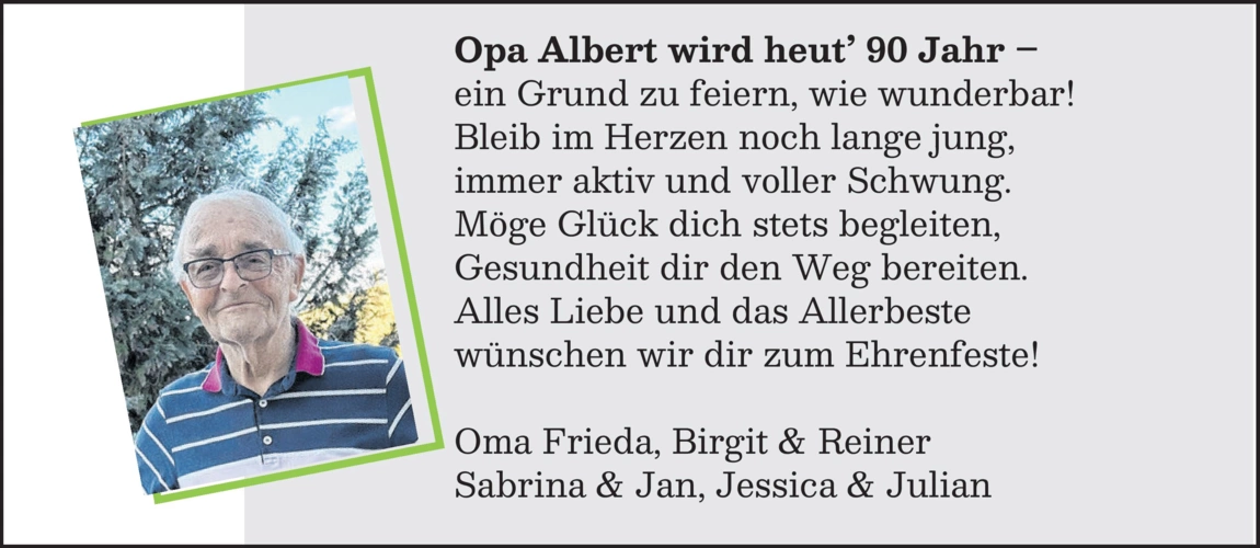Ein Grund zu feiern, wie wunderbar! Bleib im Herzen noch lange jung, immer aktiv und voller Schwung. Möge Glück dich stets begleiten, Gesundheit dir den Weg bereiten.