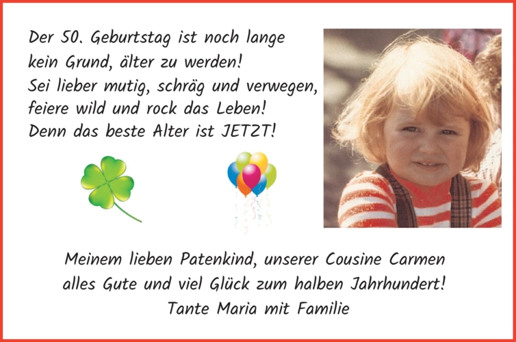 Der 50. Geburtstag ist noch lange kein Grund, älter zu werden!Sei lieber mutig, schräg und verwegen,feiere wild und rock das Leben!Denn das beste Alter ist JETZT! Meinem lieben Patenkind, unserer Cousine Carmen alles Gute und viel Glück zum halben Jahrhundert! Tante Maria mit Familie