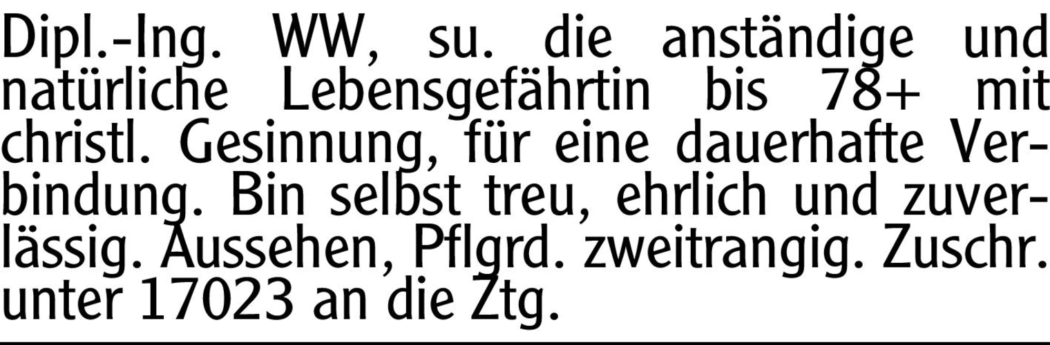 Dipl.-Ing. WW, su. die anständige und natürliche Lebensgefährtin bis 78+ mit christl. Gesinnung, für eine dauerhafte Verbindung.