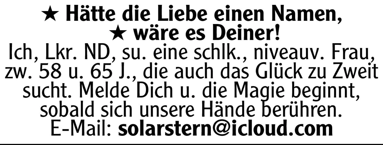 Ich, Lkr. ND, su. eine schlk., niveauv. Frau, zw. 58 u. 65 J., die auch das Glück zu Zweit sucht. Melde Dich u. die Magie beginnt, sobald sich unsere Hände berühren.