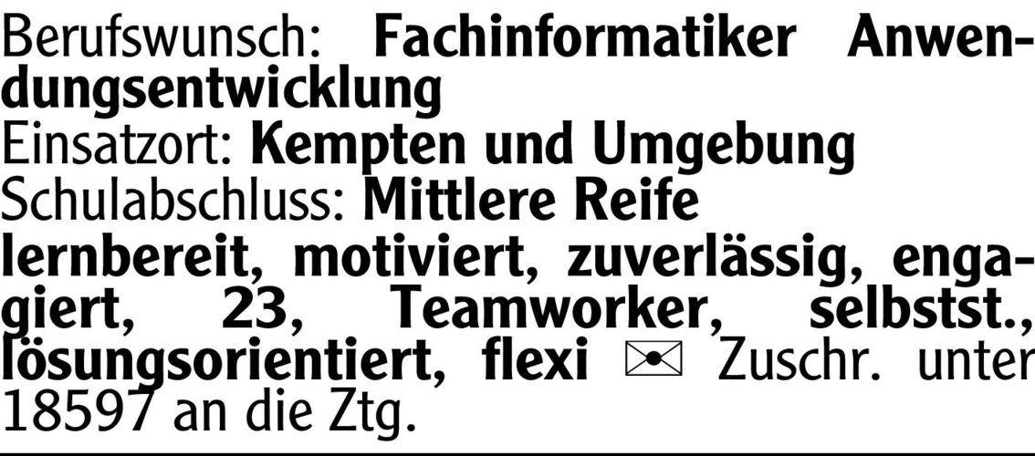 Ich bin eine lernbereite, motivierte und zuverlässige Person, die gerne im Team arbeitet. Mit meiner Engagement und Eigeninitiative bringe ich die richtige Einstellung für eine erfolgreiche Ausbildung mit.