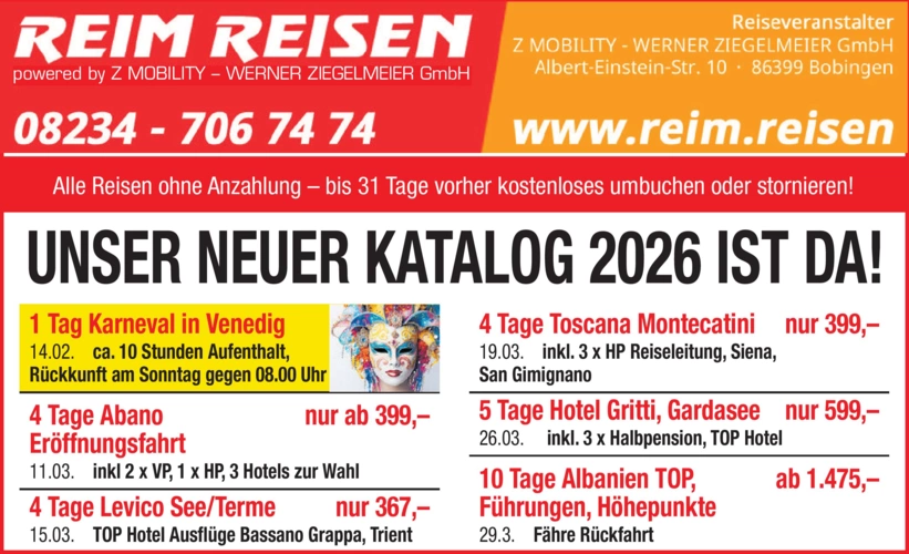powered by Z MOBILITY WERNER ZIEGELMEIER GmbH Alle Reisen ohne Anzahlung bis 31 Tage vorher kostenloses umbuchen oder stornieren! Unser neUer Katalog 2026 ist da! 1 tag Karneval in Venedig 4 tage toscana Montecatini 14.02. ca. 10 stunden aufenthalt, rückkunft am sonntag gegen 08.00 Uhr 4 tage abano eröffnungsfahrt 19.03. inkl. 3 x HP reiseleitung, siena, san gimignano nur ab 399, 11.03. inkl 2 x VP, 1 x HP, 3 Hotels zur Wahl 4 tage levico see/terme nur 367, 15.03. toP Hotel ausflüge Bassano grappa, trient nur 399, 5 tage Hotel gritti, gardasee nur 599, 26.03. inkl. 3 x Halbpension, toP Hotel 10 tage albanien toP, Führungen, Höhepunkte 29.3. Fähre rückfahrt ab 1.475,