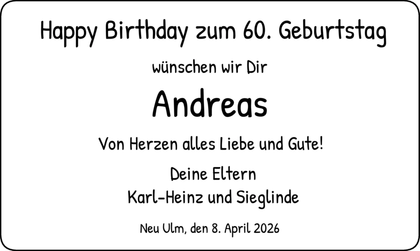 Happy Birthday zum 60. Geburtstag wünschen wir Dir Andreas Von Herzen alles Liebe und Gute! Deine ElternKarl-Heinz und Sieglinde Neu Ulm, den 8. April 2026