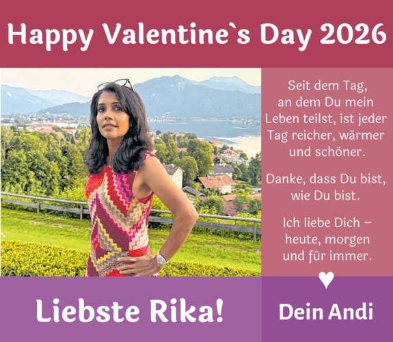 Happy Valentine´s Day 2026 Seit dem Tag,an dem Du mein Leben teilst, ist jeder Tag reicher, wärmer und schöner.Danke, dass Du bist, wie Du bist. Ich liebe Dich heute, morgenund für immer. [HT:01] Liebste Rika! Dein Andi