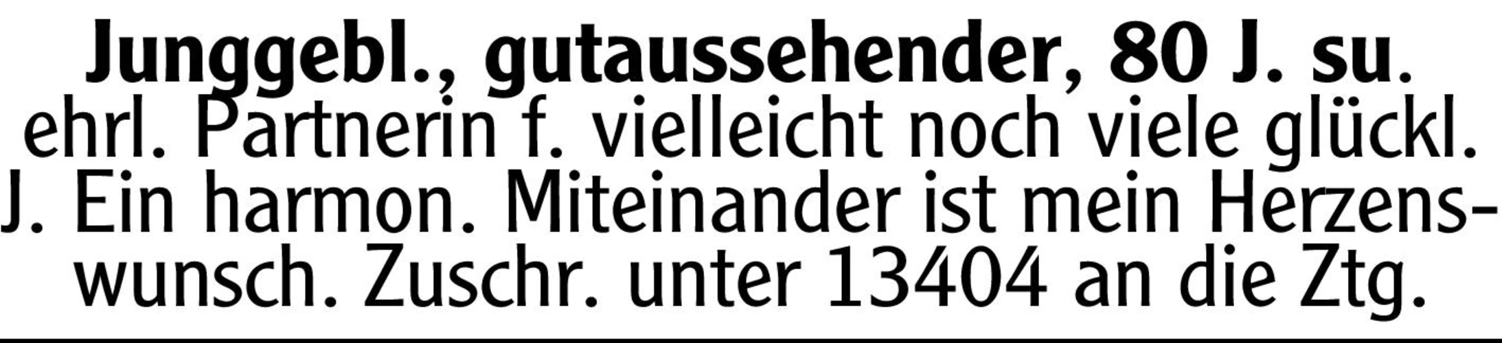 Junggebl., gutaussehender, 80 J. su. ehrl. Partnerin f. vielleicht noch viele glückl. J. Ein harmon. Miteinander ist mein Herzenswunsch. Chiffre-Nr.: 13404