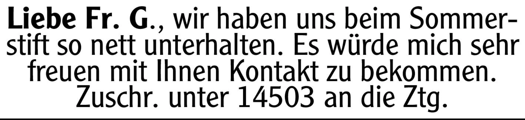 Liebe Fr. G., wir haben uns beim Sommerstift so nett unterhalten. Es würde mich sehr freuen mit Ihnen Kontakt zu bekommen. Chiffre-Nr.: 14503