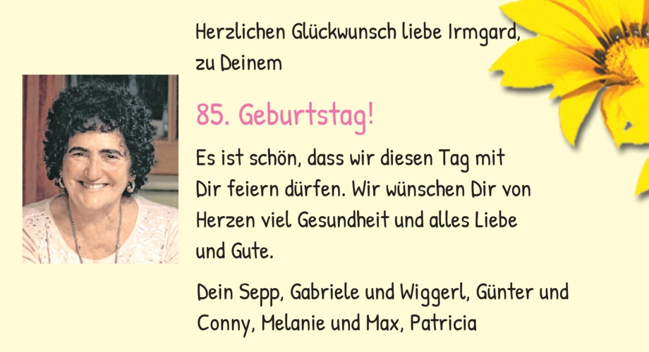 Herzlichen Glückwunsch liebe Irmgard, zu Deinem 85. Geburtstag! Es ist schön, dass wir diesen Tag mit Dir feiern dürfen. Wir wünschen Dir von Herzen viel Gesundheit und alles Liebe und Gute. Dein Sepp, Gabriele und Wiggerl, Günter und Conny, Melanie und Max, Patricia