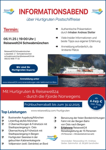Anmeldung unter www.reisewelt24.com/veranstaltungen oder telefonisch im Büro.