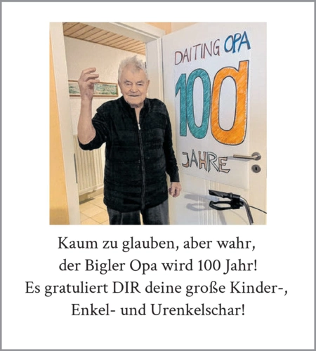 Kaum zu glauben, aber wahr, der Bigler Opa wird 100 Jahr!Es gratuliert DIR deine große Kinder-, Enkel- und Urenkelschar!