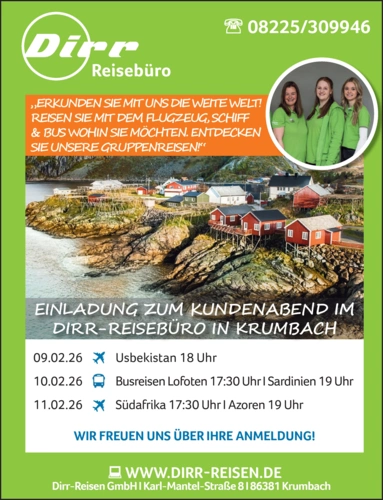 EINLADUNG ZUM KUNDENABEND IM DIRR-REISEBÜRO IN KRUMBACH
