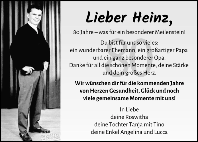 Lieber Heinz, 80 Jahre was für ein besonderer Meilenstein!Du bist für uns so vieles:ein wunderbarer Ehemann, ein großartiger Papa und ein ganz besonderer Opa.Danke für all die schönen Momente, deine Stärke und dein großes Herz.Wir wünschen dir für die kommenden Jahrevon Herzen Gesundheit, Glück und nochviele gemeinsame Momente mit uns! In Liebedeine Roswithadeine Tochter Tanja mit Tinodeine Enkel Angelina und Lucca