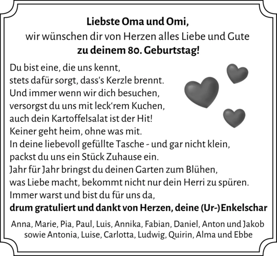 Liebste Oma und Omi, wir wünschen dir von Herzen alles Liebe und Gute zu deinem 80. Geburtstag!Du bist eine, die uns kennt,stets dafür sorgt, dass's Kerzle brennt.Und immer wenn wir dich besuchen,versorgst du uns mit leckrem Kuchen,auch dein Kartoffelsalat ist der Hit!Keiner geht heim, ohne was mit.In deine liebevoll gefüllte Tasche - und gar nicht klein,packst du uns ein Stück Zuhause ein.Jahr für Jahr bringst du deinen Garten zum Blühen,was Liebe macht, bekommt nicht nur dein Herri zu spüren.Immer warst und bist du für uns da,drum gratuliert und dankt von Herzen, deine (Ur-)EnkelscharAnna, Marie, Pia, Paul, Luis, Annika, Fabian, Daniel, Anton und Jakob sowie Antonia, Luise, Carlotta, Ludwig, Quirin, Alma und Ebbe