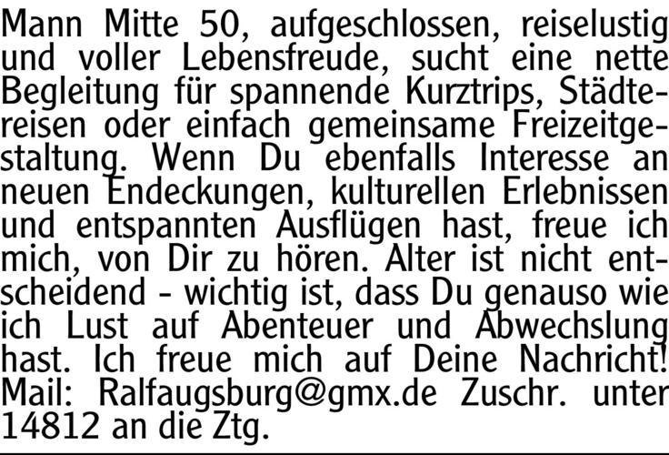 Mann Mitte 50, aufgeschlossen, reiselustig und voller Lebensfreude, sucht eine nette Begleitung für spannende Kurztrips, Städtereisen oder einfach gemeinsame Freizeitgestaltung. Wenn Du ebenfalls Interesse an neuen Endeckungen, kulturellen Erlebnissen und entspannten Ausflügen hast, freue ich mich, von Dir zu hören. Alter ist nicht entscheidend - wichtig ist, dass Du genauso wie ich Lust auf Abenteuer und Abwechslung hast. Ich freue mich auf Deine Nachricht! Mail: Ralfaugsburg@gmx.de Chiffre-Nr.: 14812