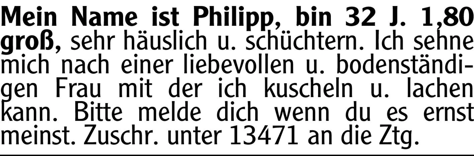 Mein Name ist Philipp, bin 32 J. 1,80 groß, sehr häuslich u. schüchtern. Ich sehne mich nach einer liebevollen u. bodenständigen Frau mit der ich kuscheln u. lachen kann. Bitte melde dich wenn du es ernst meinst.