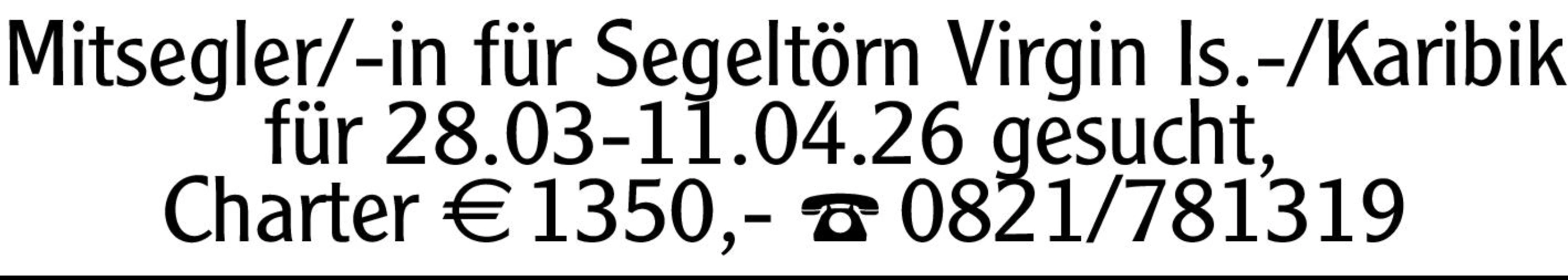 Mitsegler/-in für Segeltörn Virgin Is.-/Karibik für 28.03-11.04.26 gesucht Charter EUR1350,- Tel. 0821/781319