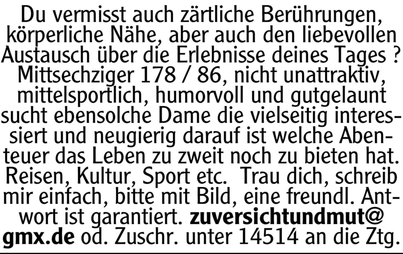 Du vermisst auch zärtliche Berührungen, körperliche Nähe, aber auch den liebevollen Austausch über die Erlebnisse deines Tages ? Mittsechziger 178 / 86, nicht unattraktiv, mittelsportlich, humorvoll und gutgelaunt sucht ebensolche Dame die vielseitig interessiert und neugierig darauf ist welche Abenteuer das Leben zu zweit noch zu bieten hat. Reisen, Kultur, Sport etc. Trau dich, schreib mir einfach, bitte mit Bild, eine freundl. Antwort ist garantiert. zuversichtundmut@gmx.de od. Chiffre-Nr.: 14514