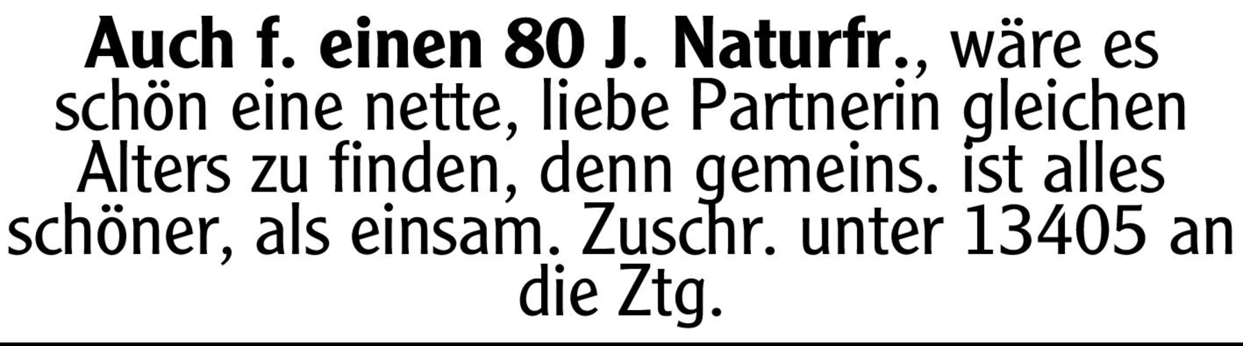 Auch für einen 80-jährigen Naturfreund wäre es schön, eine nette, liebe Partnerin gleichen Alters zu finden, denn gemeinschaftlich ist alles schöner, als einsam. Chiffre-Nr.: 13405