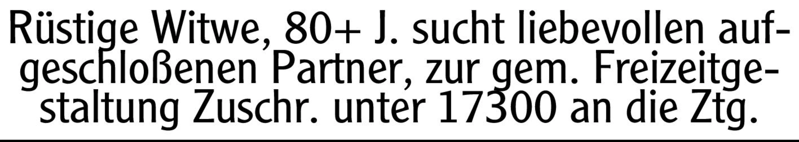 Rüstige Witwe, 80+ J. sucht liebevollen aufgeschloßenen Partner, zur gem. Freizeitgestaltung