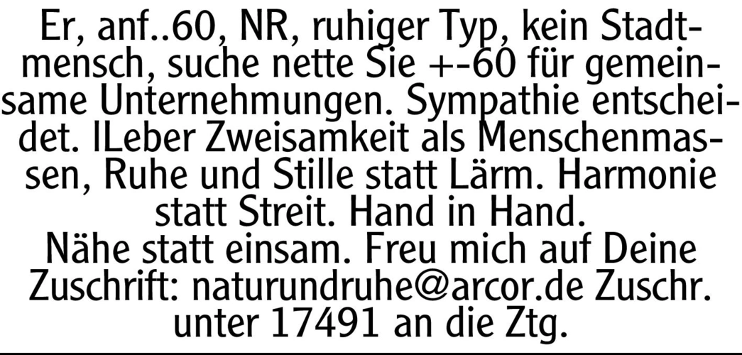 Er, Anfang 60, NR, ruhiger Typ, kein Stadtmensch, suche nette Sie +-60 für gemeinsame Unternehmungen. Sympathie entscheidet.