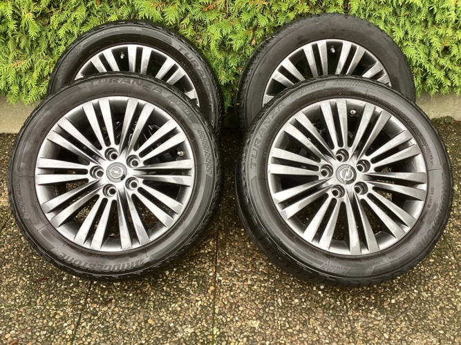 Sommer Kmompletträder, "Bridgestone" 225/50 R17 98 V mit ca. 3 mm Profiltiefe, montiert auf Alufelgen mit Reifendrucksensoren, geeignet z.B. für Opel Zafira od. Opel Astra J.