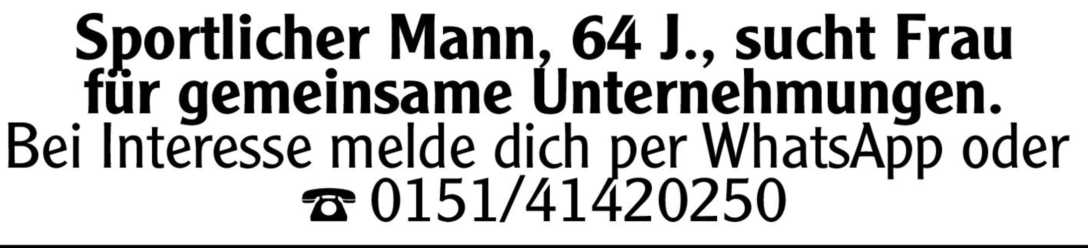 Sportlicher Mann, 64 J., sucht Frau für gemeinsame Unternehmungen. Bei Interesse melde dich per WhatsApp oder Tel. 0151/41420250