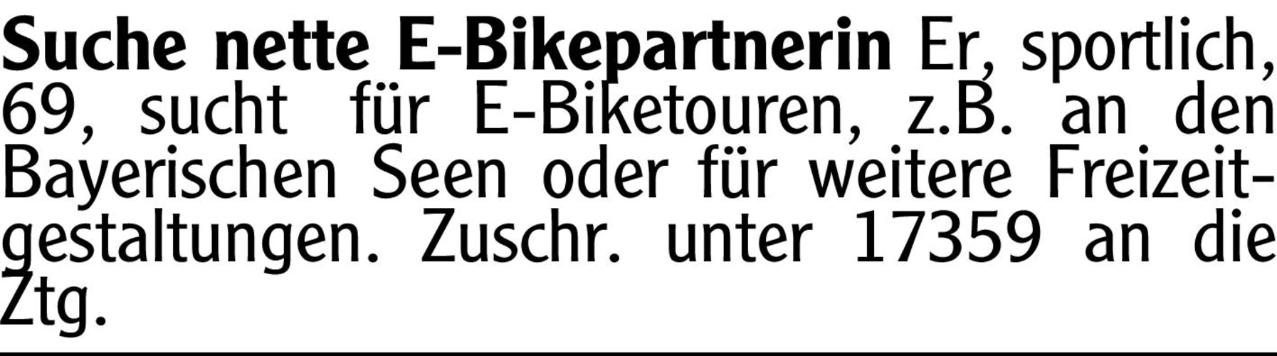 Er, sportlich, 69, sucht für E-Biketouren, z.B. an den Bayerischen Seen oder für weitere Freizeitgestaltungen.