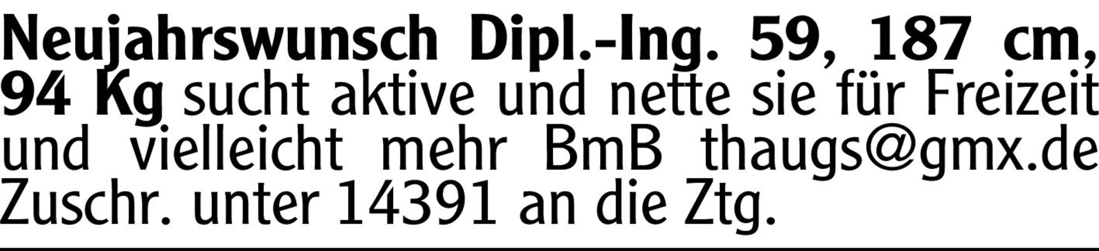 Neujahrswunsch Dipl.-Ing. 59, 187 cm, 94 Kg sucht aktive und nette sie für Freizeit und vielleicht mehr BmB thaugs@gmx.de Chiffre-Nr.: 14391