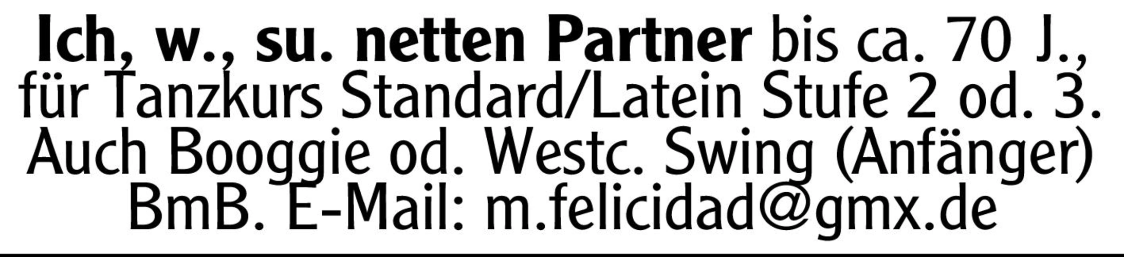 Ich, w., su. netten Partner bis ca. 70J., für Tanzkurs Standard/Latein Stufe 2 od. 3. Auch Booggie od. Westc. Swing (Anfänger) BmB.