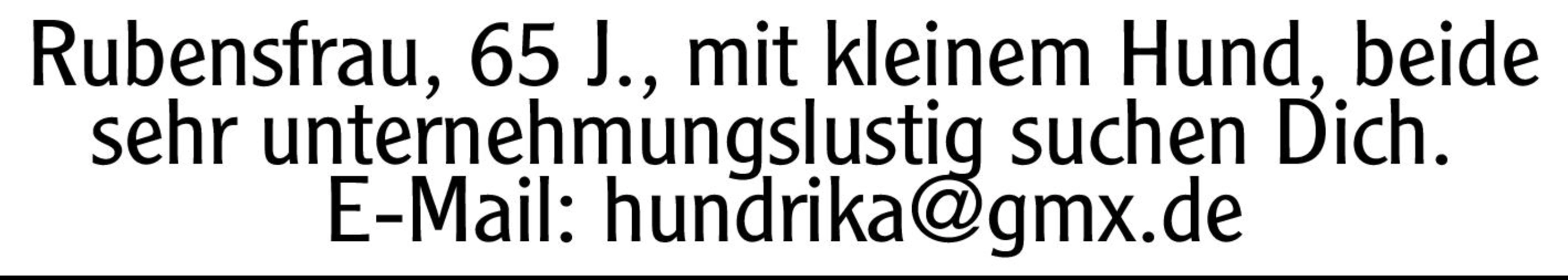 Rubensfrau, 65 J., mit kleinem Hund, beide sehr unternehmungslustig suchen Dich. E-Mail: hundrika@gmx.de